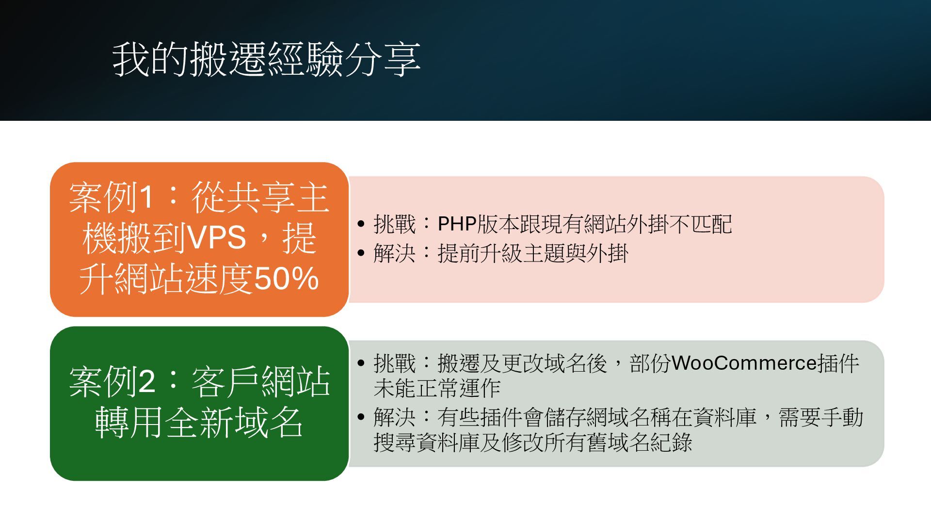 我的搬遷經驗分享 • 挑戰:PHP版本跟現有網站外掛不匹配 • 解決:提前升級主題與外掛 案例1:從共享主 機搬到VPS,提 升網站速度50% • 挑戰:搬遷及更改域名後,部份WooCommerce插件