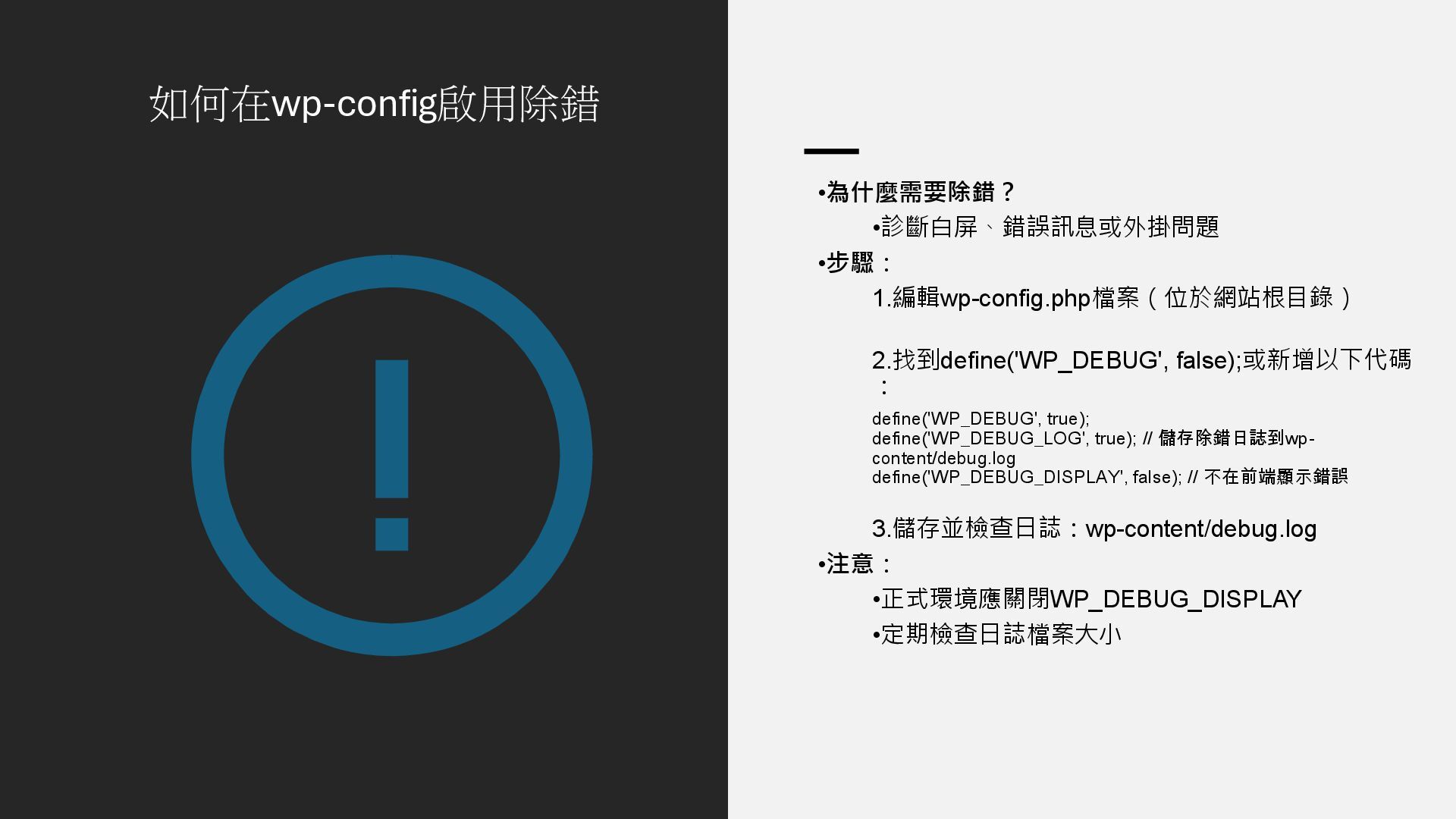 如何在wp-config啟用除錯 •為什麼需要除錯? •診斷白屏、錯誤訊息或外掛問題 •步驟: 1.編輯wp-config.php檔案(位於網站根目錄) 2.找到define('WP_DEBUG', false);或新增以下代碼 : define('WP_DEBUG', true);