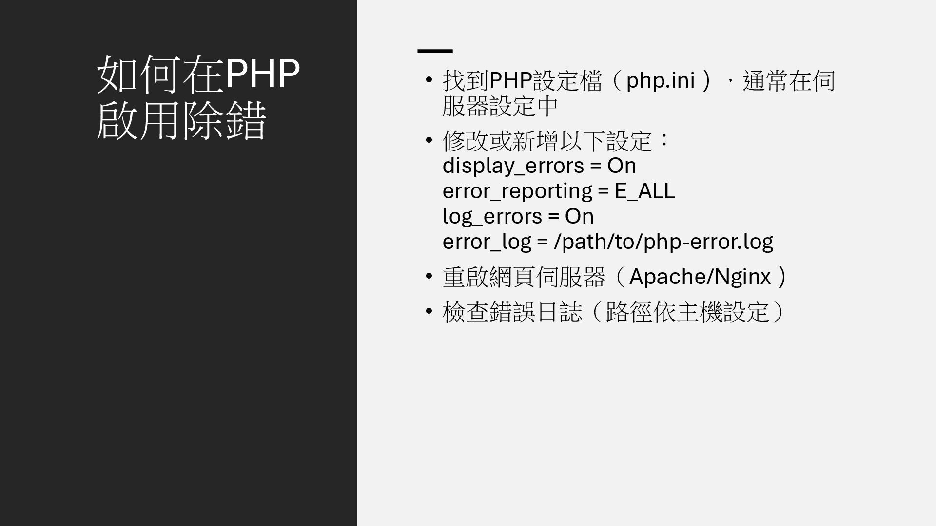 error_reporting = E_ALL log_errors = On error_log = /path/to/php-error.log • 重啟網頁伺服器(Apache/Nginx) • 檢查錯誤日誌(路徑依主機設定)