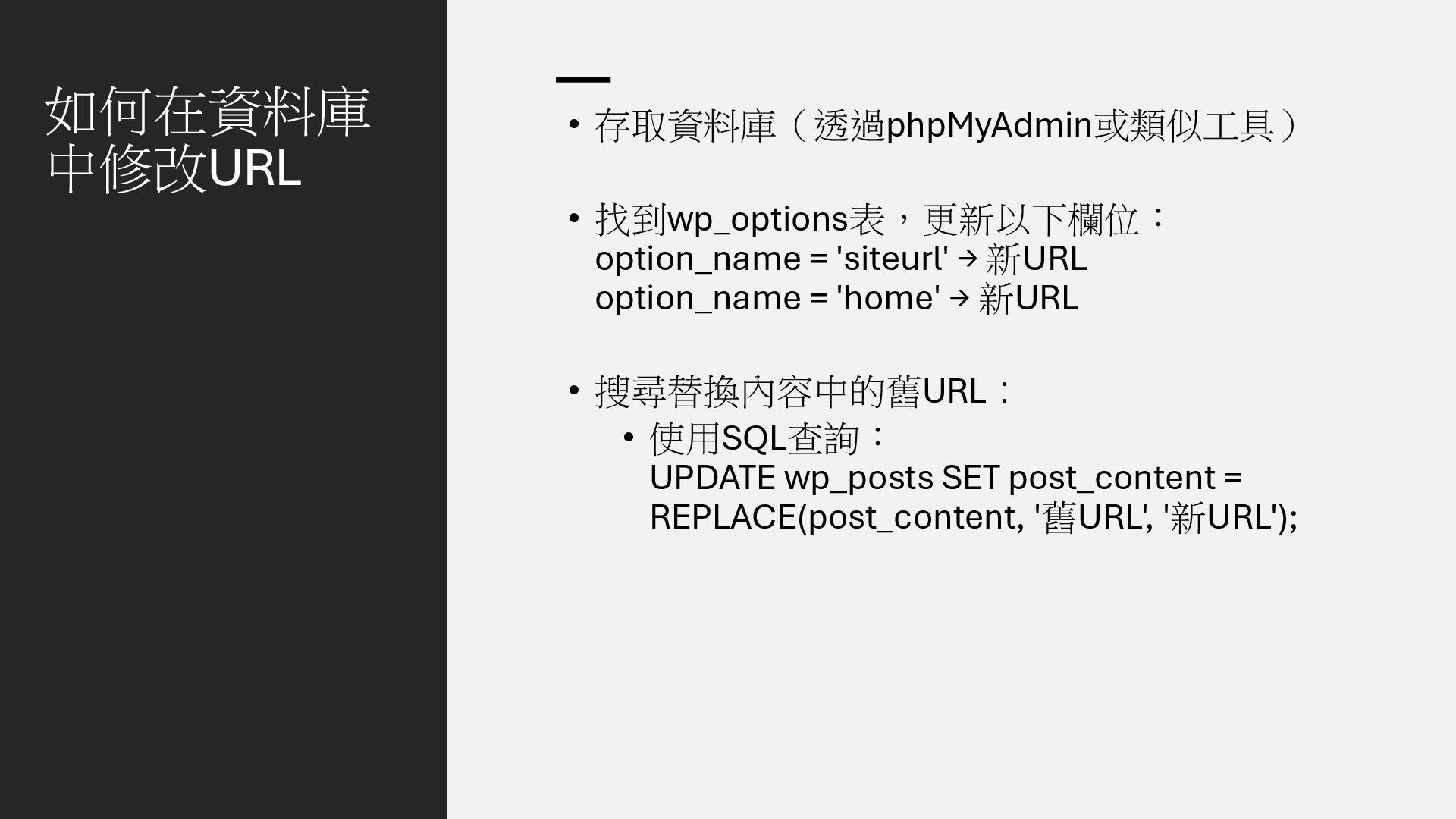 新URL option_name = 'home' → 新URL • 搜尋替換內容中的舊URL: • 使用SQL查詢: UPDATE wp_posts SET post_content = REPLACE(post_content, '舊URL', '新URL');