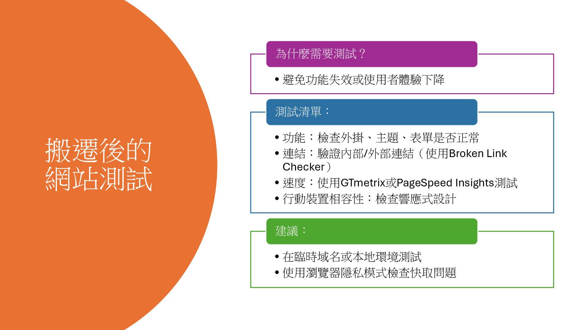 搬遷後的 網站測試 • 避免功能失效或使用者體驗下降 為什麼需要測試? • 功能:檢查外掛、主題、表單是否正常 • 連結:驗證內部/外部連結(使用Broken Link