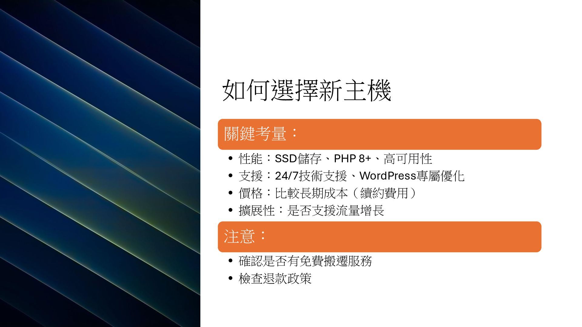 如何選擇新主機 關鍵考量: • 性能:SSD儲存、PHP 8+、高可用性 • 支援:24/7技術支援、WordPress專屬優化 • 價格:比較長期成本(續約費用) •