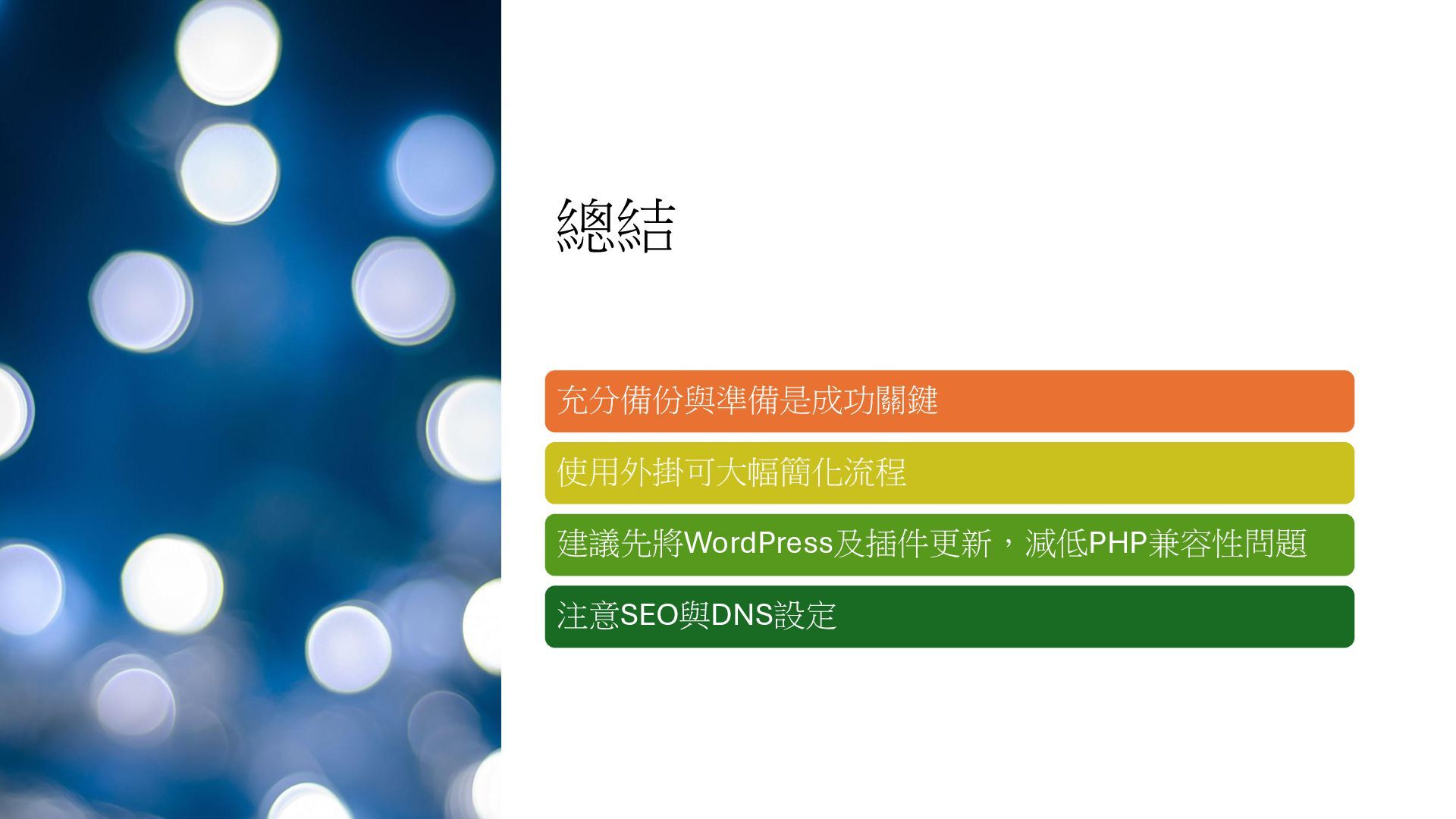 總結 充分備份與準備是成功關鍵 使用外掛可大幅簡化流程 建議先將WordPress及插件更新,減低PHP兼容性問題 注意SEO與DNS設定