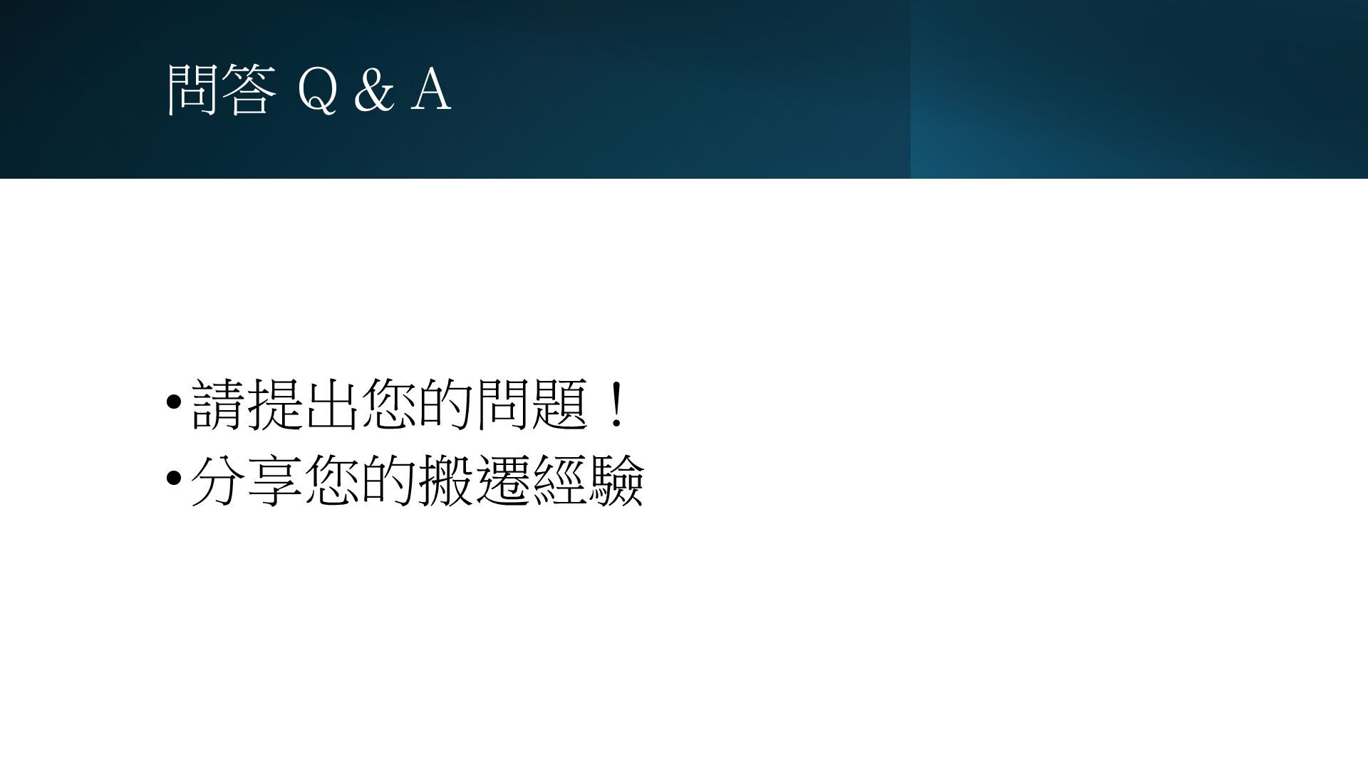 問答 Q&A •請提出您的問題! •分享您的搬遷經驗