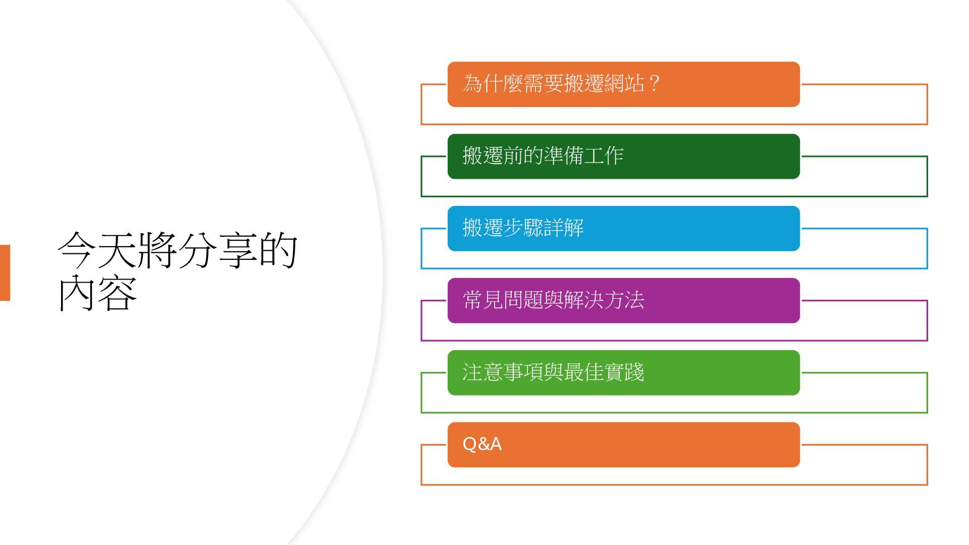 今天將分享的 內容 為什麼需要搬遷網站? 搬遷前的準備工作 搬遷步驟詳解 常見問題與解決方法 注意事項與最佳實踐 Q&A