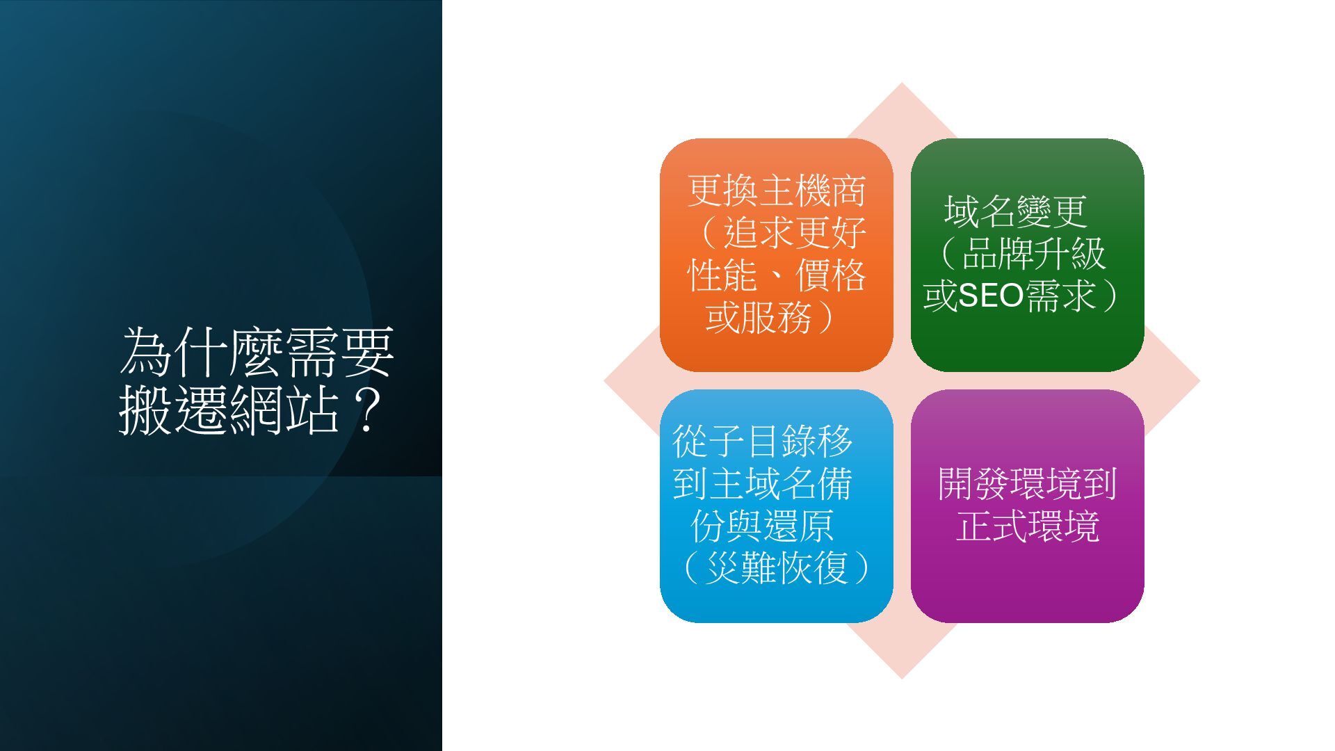 為什麼需要 搬遷網站? 更換主機商 (追求更好 性能、價格 或服務) 域名變更 (品牌升級 或SEO需求) 從子目錄移