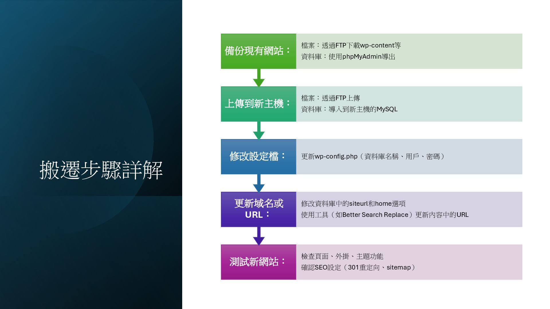 修改設定檔: 更新wp-config.php(資料庫名稱、用戶、密碼) 上傳到新主機: 檔案:透過FTP上傳 資料庫:導入到新主機的MySQL 備份現有網站: 檔案:透過FTP下載wp-content等 資料庫:使用phpMyAdmin導出