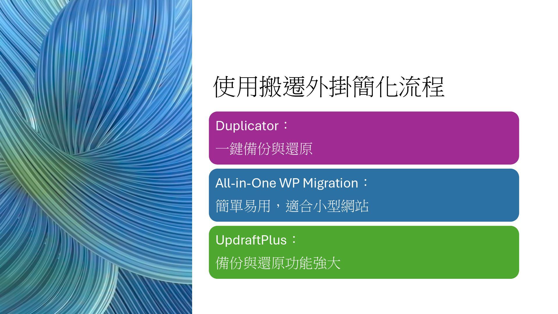 使用搬遷外掛簡化流程 Duplicator: 一鍵備份與還原 All-in-One WP Migration: 簡單易用,適合小型網站 UpdraftPlus: 備份與還原功能強大