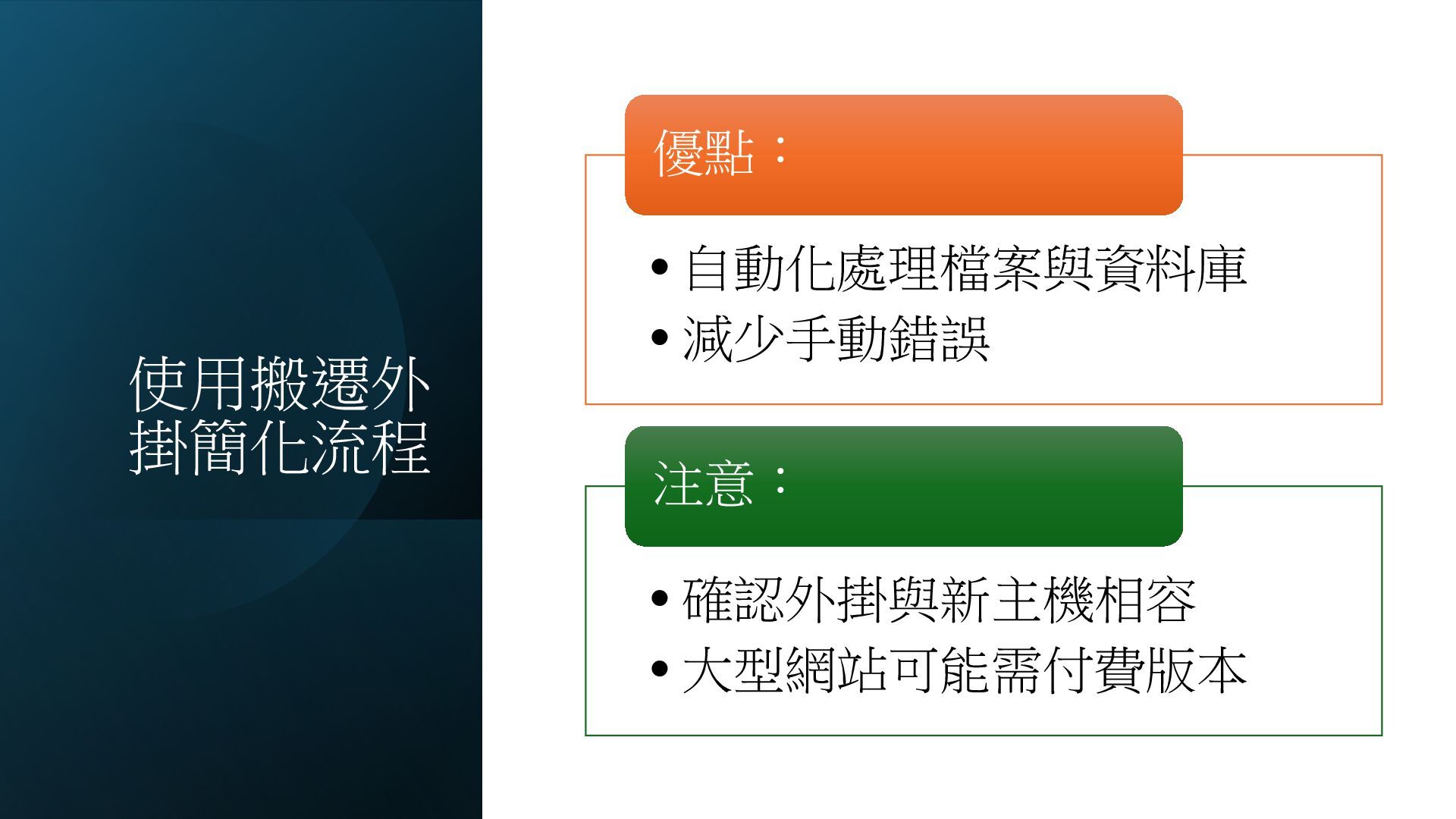 使用搬遷外 掛簡化流程 • 自動化處理檔案與資料庫 • 減少手動錯誤 優點: • 確認外掛與新主機相容 •