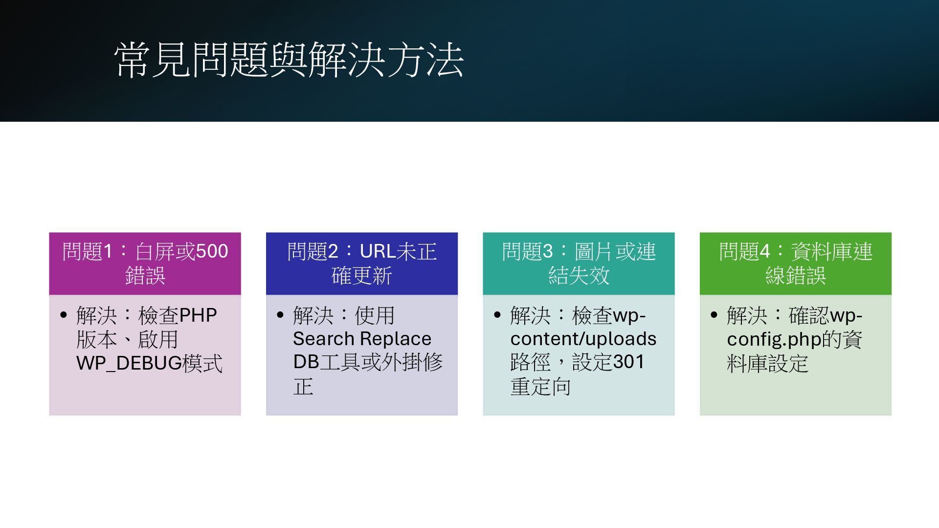 解決:使用 Search Replace DB工具或外掛修 正 問題3:圖片或連 結失效 • 解決:檢查wp- content/uploads 路徑,設定301 重定向 問題4:資料庫連 線錯誤 • 解決:確認wp- config.php的資 料庫設定