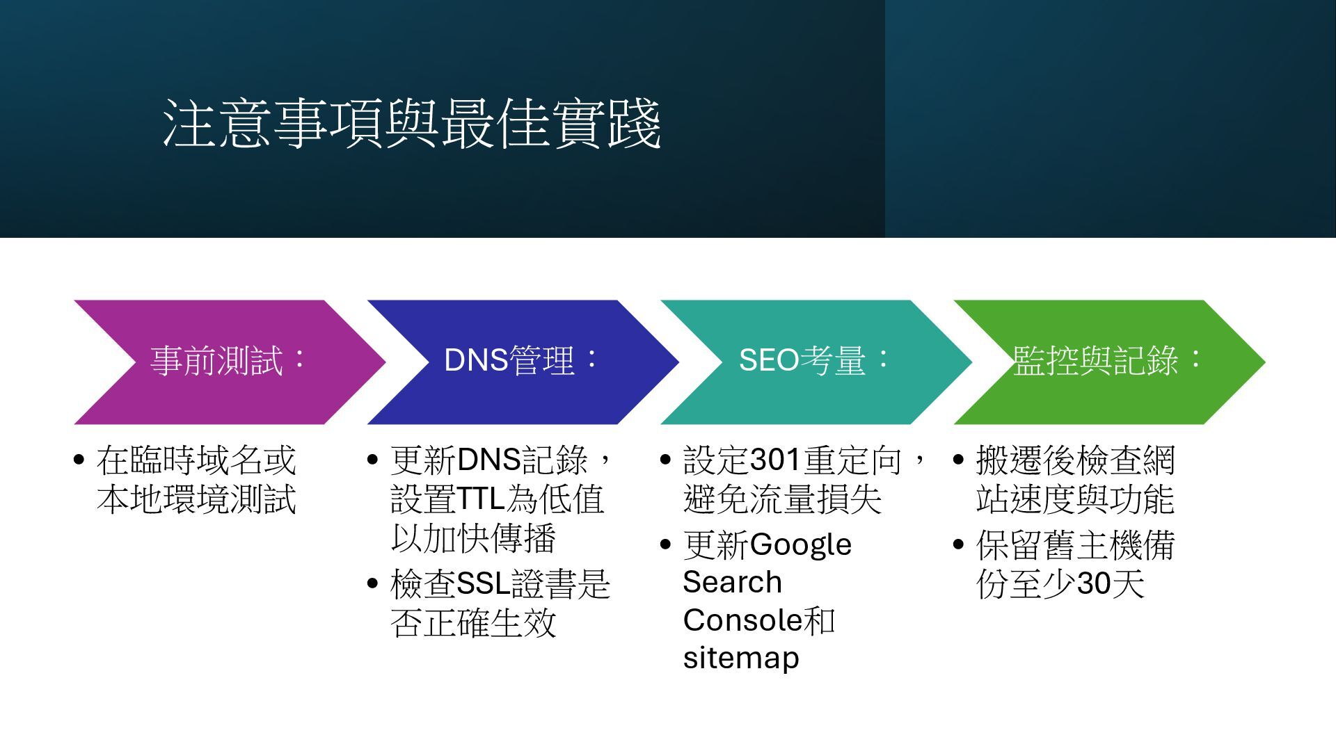 • 檢查SSL證書是 否正確生效 SEO考量: • 設定301重定向, 避免流量損失 • 更新Google Search Console和 sitemap 監控與記錄: • 搬遷後檢查網 站速度與功能 • 保留舊主機備 份至少30天