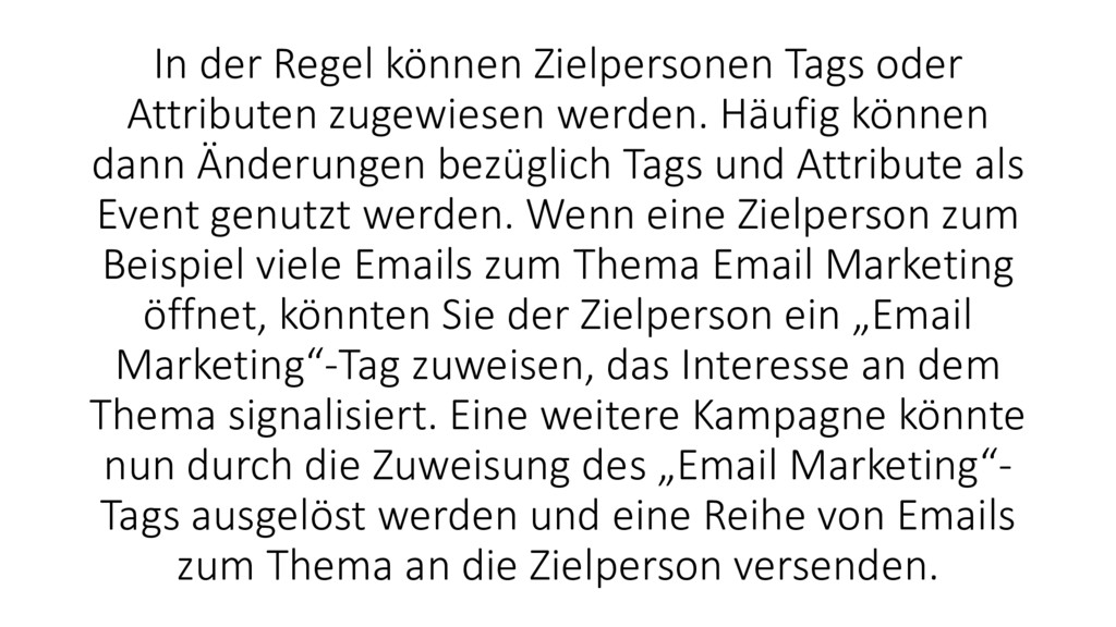 Häufig können dann Änderungen bezüglich Tags und Attribute als Event genutzt werden. Wenn eine Zielperson zum Beispiel viele Emails zum Thema Email Marketing öffnet, könnten Sie der Zielperson ein „Email Marketing“-Tag zuweisen, das Interesse an dem Thema signalisiert. Eine weitere Kampagne könnte nun durch die Zuweisung des „Email Marketing“- Tags ausgelöst werden und eine Reihe von Emails zum Thema an die Zielperson versenden.