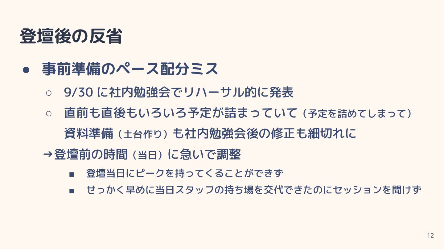 • 一方で課題も見えたので反省→次回以降に生かす ◦ 登壇準備は計画的に