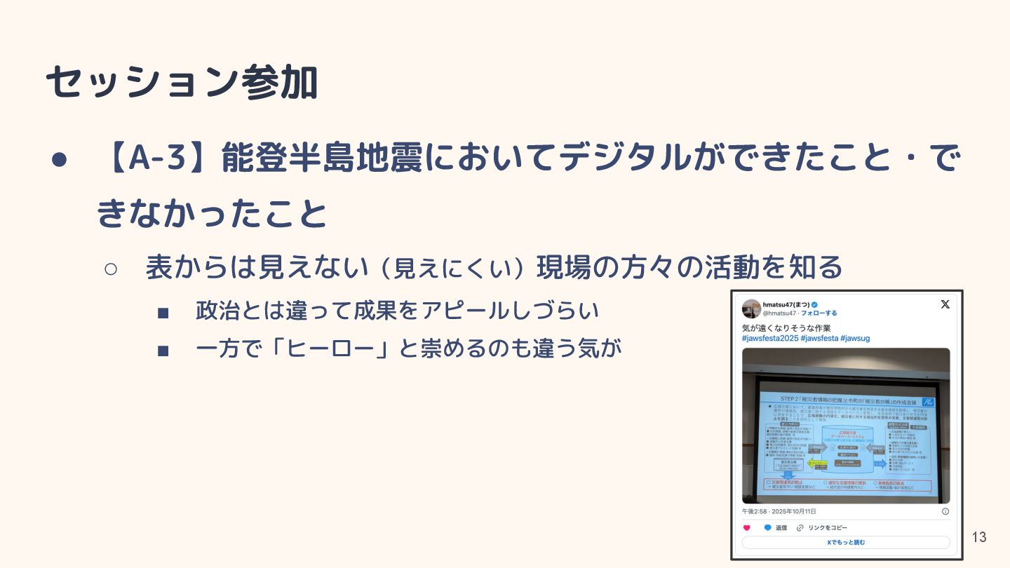 セッション参加 13 • 【A-3】能登半島地震においてデジタルができたこと・で きなかったこと ◦ 表からは見えない(見えにくい)現場の方々の活動を知る ▪ 政治とは違って成果をアピールしづらい ▪