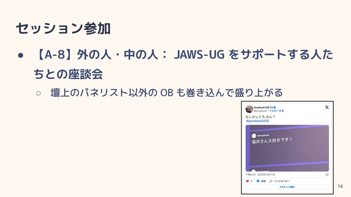 セッション参加 14 • 【A-8】外の人・中の人: JAWS-UG をサポートする人た ちとの座談会 ◦ 壇上のパネリスト以外の OB