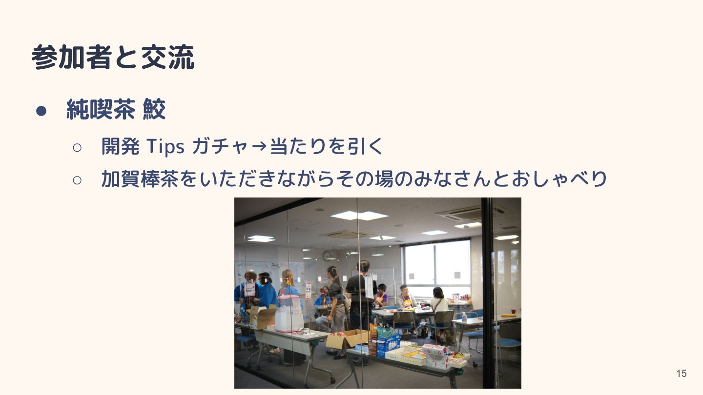 参加者と交流 15 • 純喫茶 鮫 ◦ 開発 Tips ガチャ→当たりを引く ◦