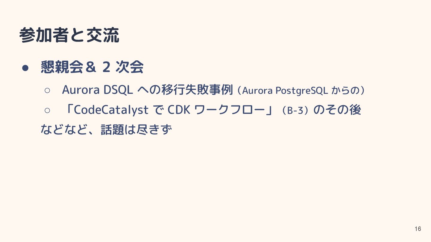 参加者と交流 16 • 懇親会& 2 次会 ◦ Aurora DSQL への移行失敗事例(Aurora