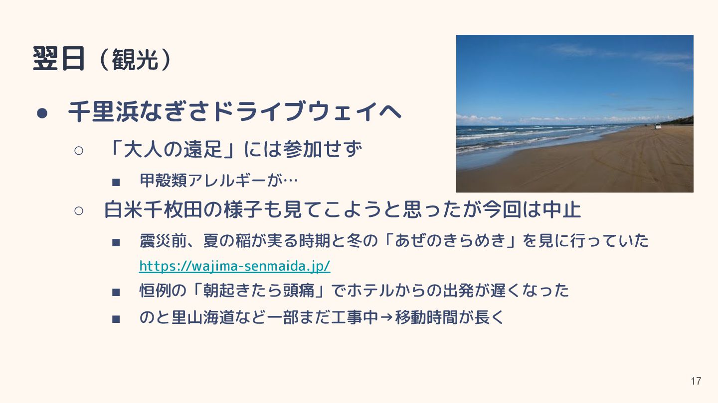 翌日(観光) 17 • 千里浜なぎさドライブウェイへ ◦ 「大人の遠足」には参加せず ▪ 甲殻類アレルギーが… ◦ 白米千枚田の様子も見てこようと思ったが今回は中止
