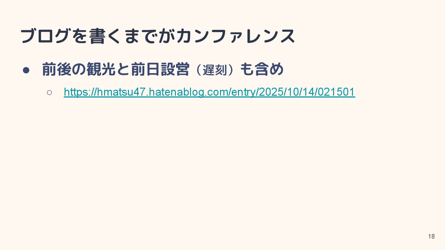 ブログを書くまでがカンファレンス 18 • 前後の観光と前日設営(遅刻)も含め ◦ https://hmatsu47.hatenablog.com/entry/2025/10/14/021501