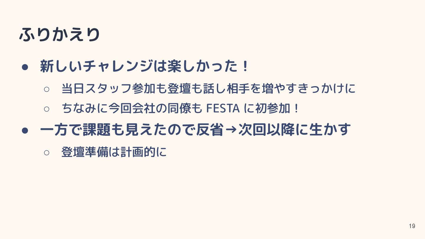 ふりかえり 19 • 新しいチャレンジは楽しかった! ◦ 当日スタッフ参加も登壇も話し相手を増やすきっかけに ◦ ちなみに今回会社の同僚も FESTA に初参加!