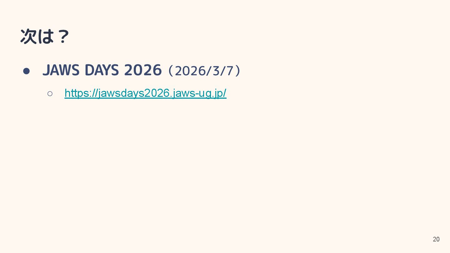 次は? 20 • JAWS DAYS 2026(2026/3/7) ◦ https://jawsdays2026.jaws-ug.jp/