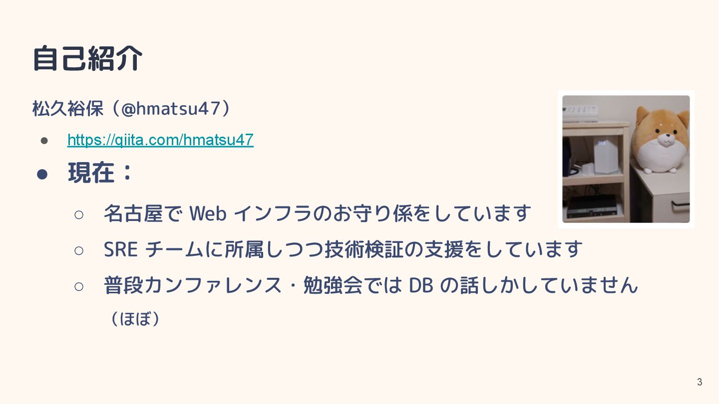 ◦ SRE チームに所属しつつ技術検証の支援をしています ◦ 普段カンファレンス・勉強会では DB の話しかしていません (ほぼ) 3