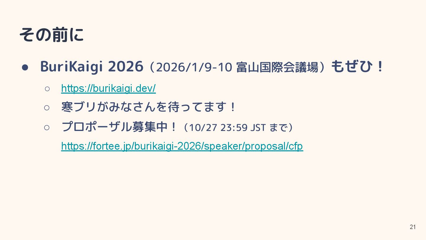その前に 21 • BuriKaigi 2026(2026/1/9-10 富山国際会議場)もぜひ! ◦ https://burikaigi.dev/ ◦ 寒ブリがみなさんを待ってます!
