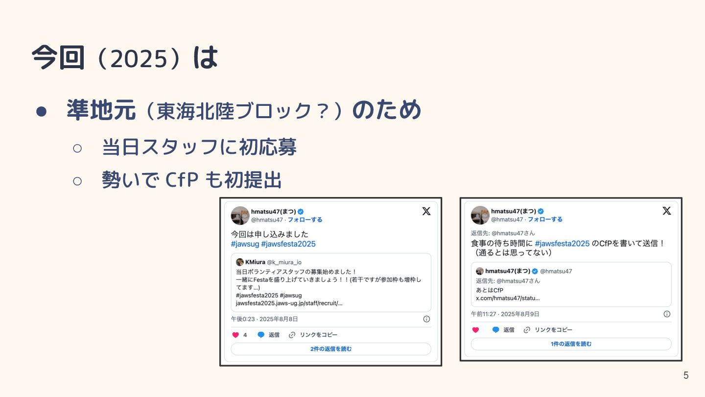 今回(2025)は 5 • 準地元(東海北陸ブロック?)のため ◦ 当日スタッフに初応募 ◦ 勢いで CfP も初提出