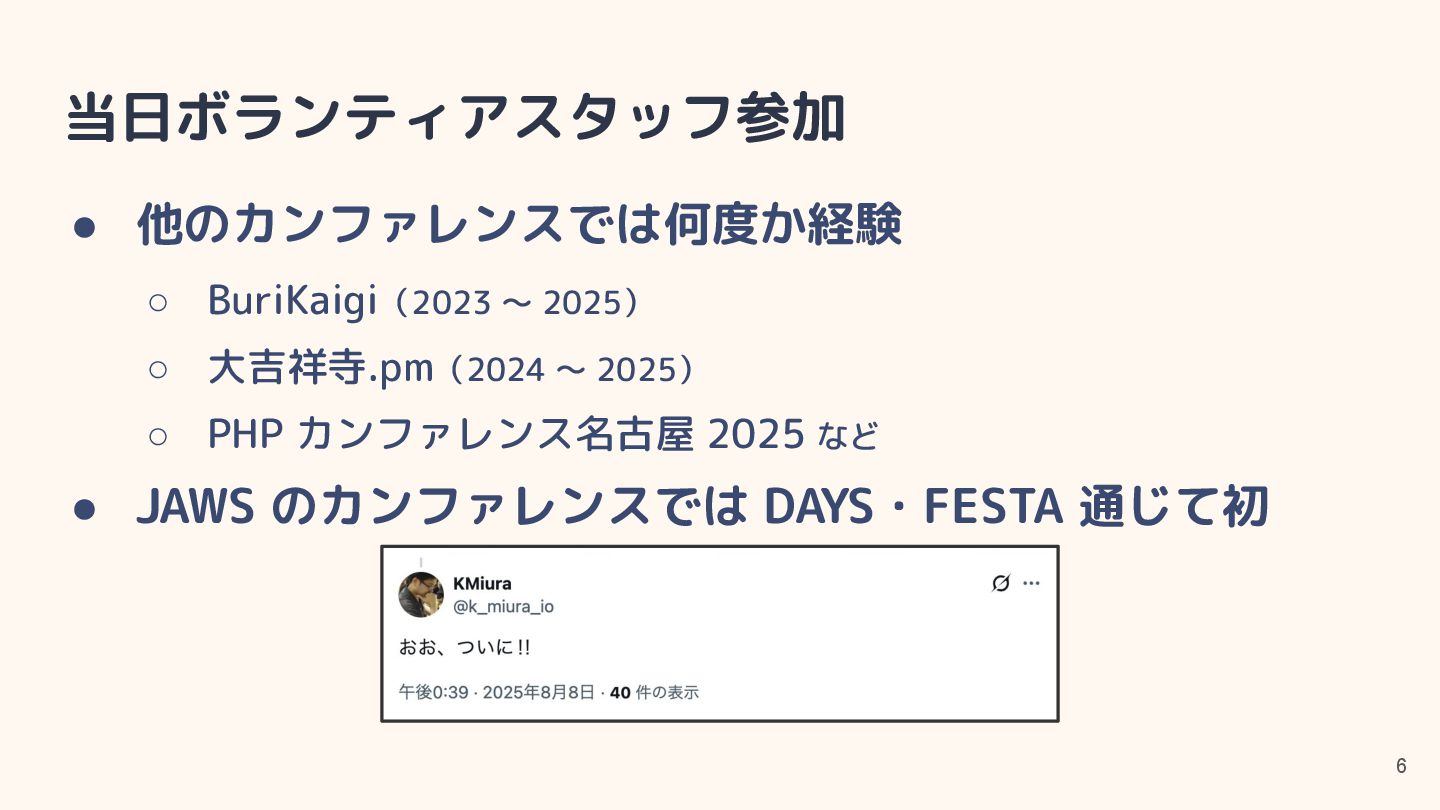 当日ボランティアスタッフ参加 6 • 他のカンファレンスでは何度か経験 ◦ BuriKaigi(2023 〜 2025) ◦ 大吉祥寺.pm(2024