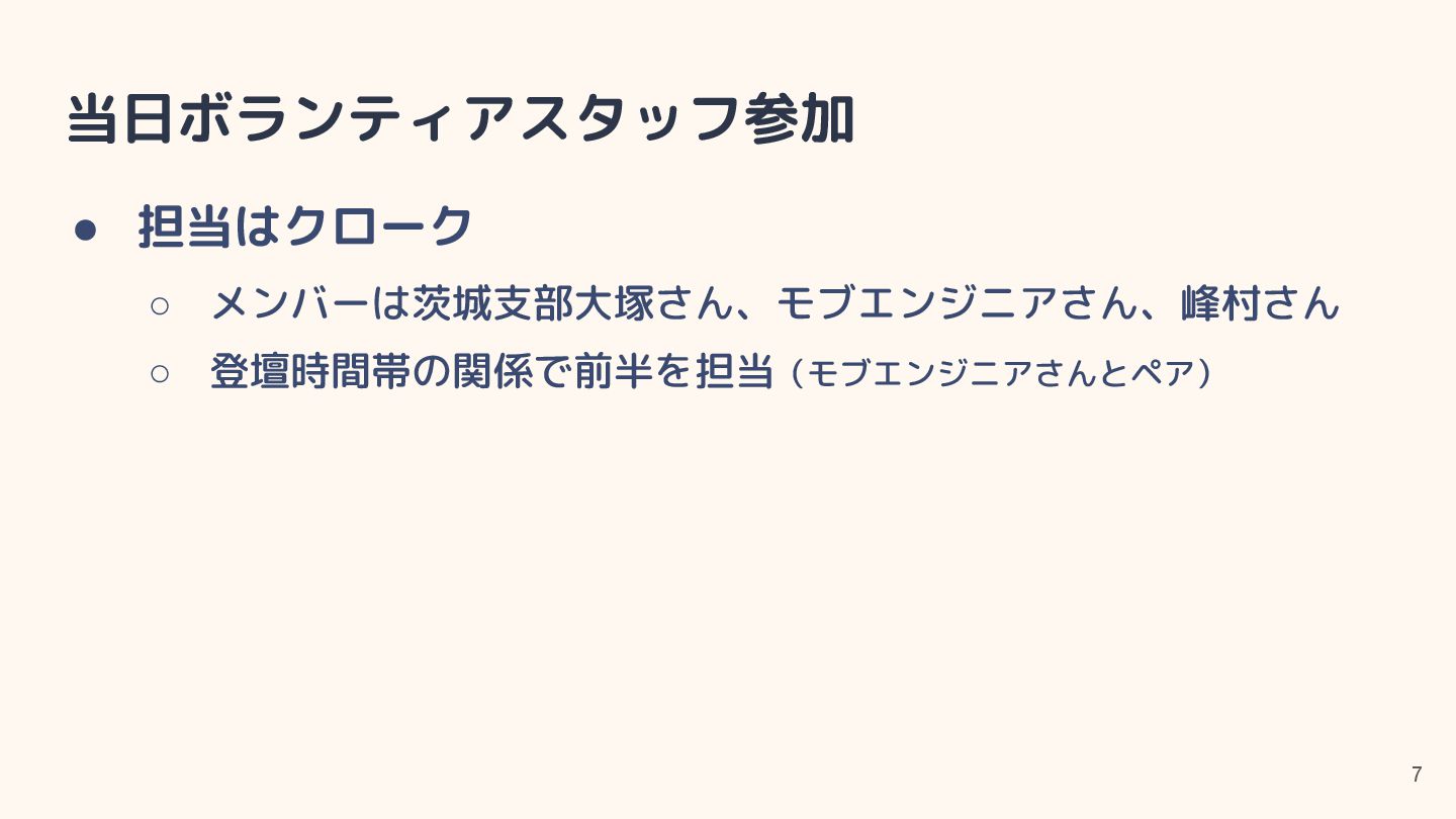 当日ボランティアスタッフ参加 7 • 担当はクローク ◦ メンバーは茨城支部大塚さん、モブエンジニアさん、峰村さん ◦ 登壇時間帯の関係で前半を担当(モブエンジニアさんとペア)