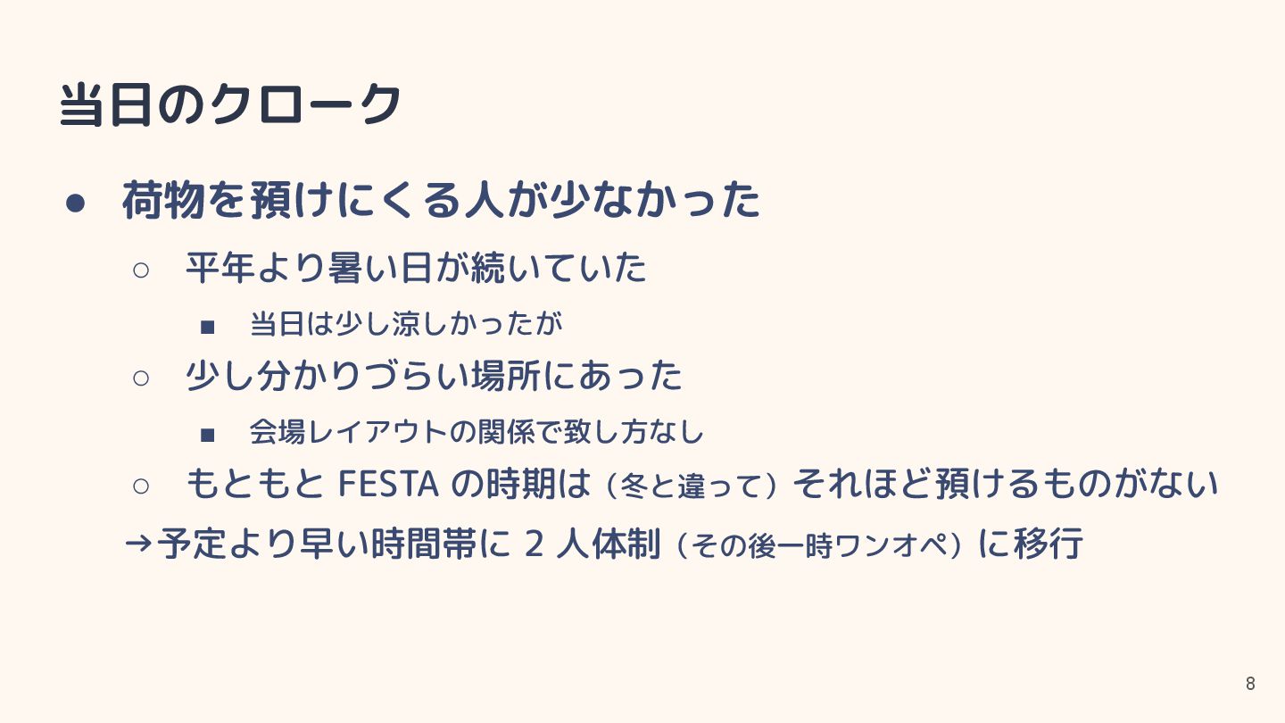 ▪ 会場レイアウトの関係で致し方なし ◦ もともと FESTA の時期は(冬と違って)それほど預けるものがない →予定より早い時間帯に 2 人体制(その後一時ワンオペ)に移行