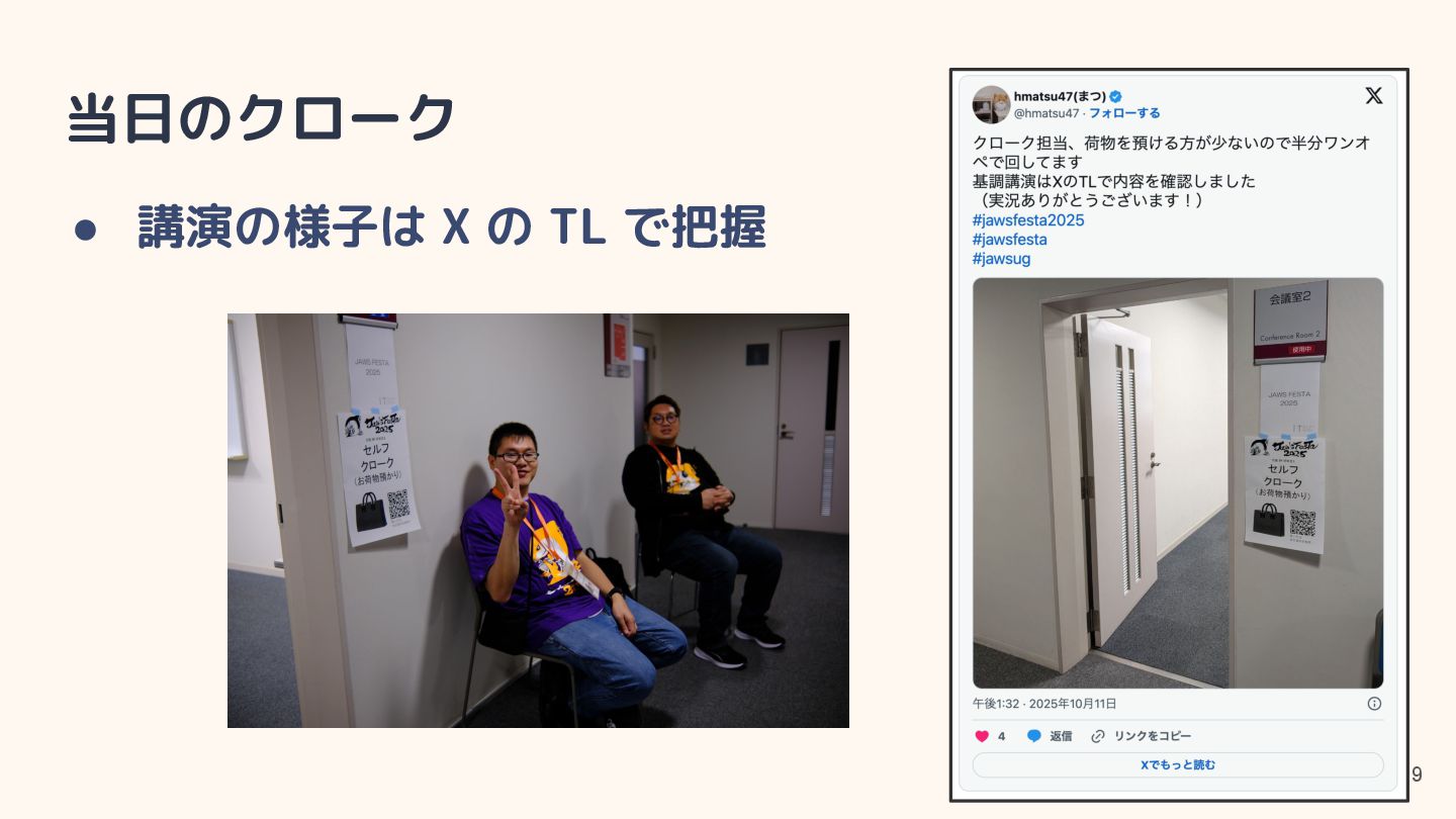 当日のクローク 9 • 講演の様子は X の TL で把握