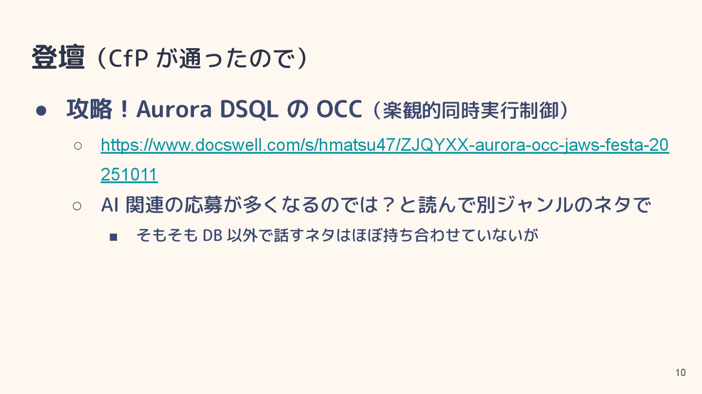 登壇(CfP が通ったので) 10 • 攻略!Aurora DSQL の OCC(楽観的同時実行制御) ◦ https://www.docswell.com/s/hmatsu47/ZJQYXX-aurora-occ-jaws-festa-20