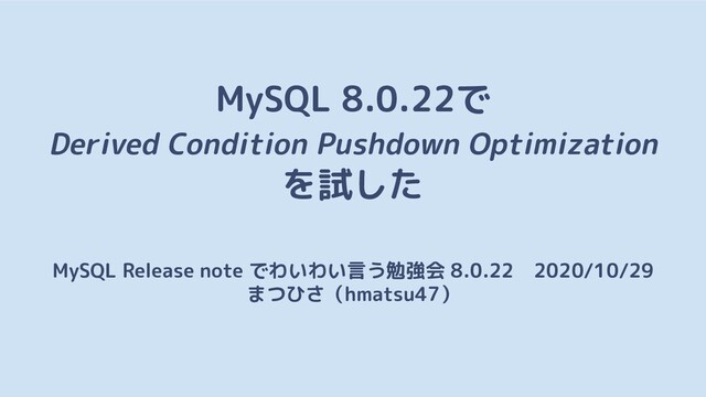 set になることも 7 mysql> SELECT * FROM (SELECT i, j, MIN(k) AS min, SUM(k) OVER (PARTITION BY i) AS sum FROM t1 GROUP BY i, j) AS dt WHERE i > 10 AND min < 3; ↓この結果が、 あるときは、 45 rows in set (0.76 sec) またあるときは、 891 rows in set (0.45 sec) さらに… Empty set (0.20 sec)