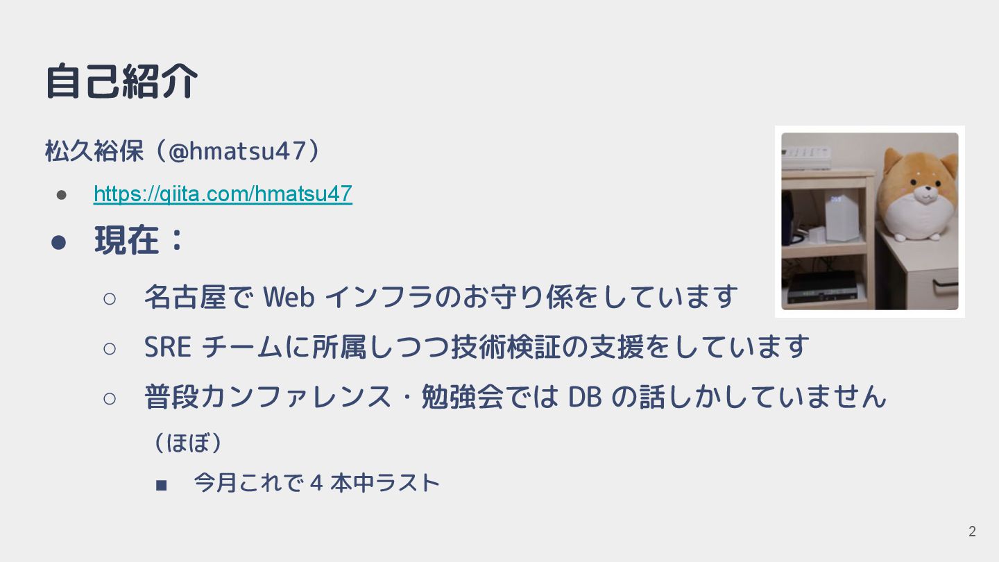 ◦ SRE チームに所属しつつ技術検証の支援をしています ◦ 普段カンファレンス・勉強会では DB の話しかしていません (ほぼ) ▪ 今月これで 4 本中ラスト 2