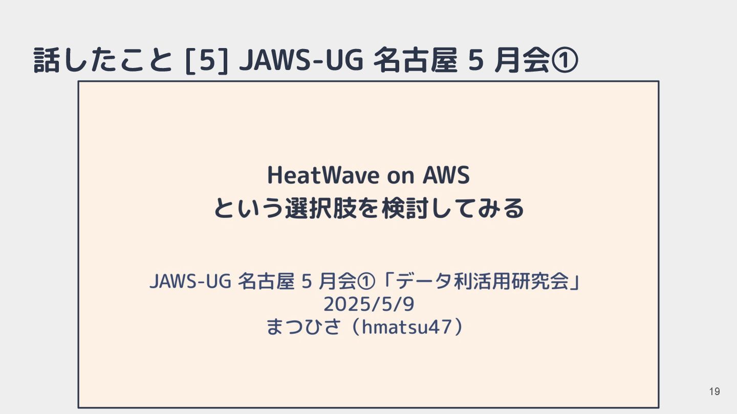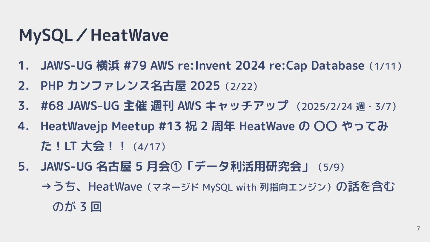 2. PHP カンファレンス名古屋 2025(2/22) 3. #68 JAWS-UG 主催 週刊 AWS キャッチアップ (2025/2/24 週・3/7) 4. HeatWavejp Meetup #13 祝 2 周年 HeatWave の 〇〇 やってみ た!LT 大会!!(4/17) 5. JAWS-UG 名古屋 5 月会①「データ利活用研究会」(5/9) →うち、HeatWave(マネージド MySQL with 列指向エンジン)の話を含む のが 3 回 7
