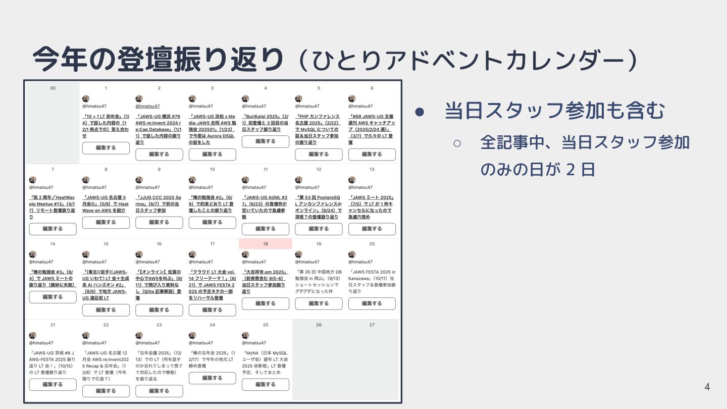 今年の登壇振り返り(ひとりアドベントカレンダー) 4 • 当日スタッフ参加も含む ◦ 全記事中、当日スタッフ参加 のみの日が 2 日