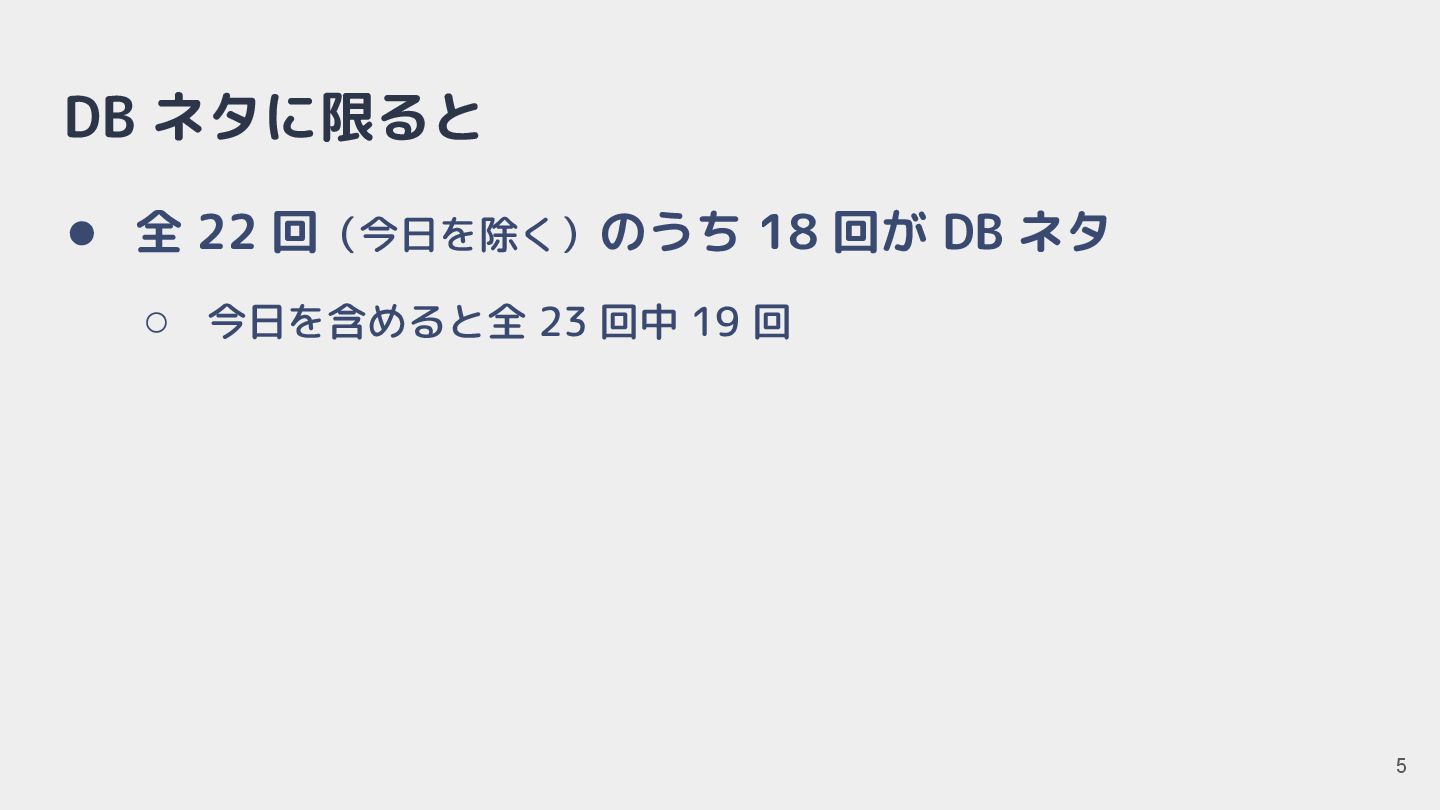 DB ネタに限ると • 全 22 回(今日を除く)のうち 18 回が DB ネタ