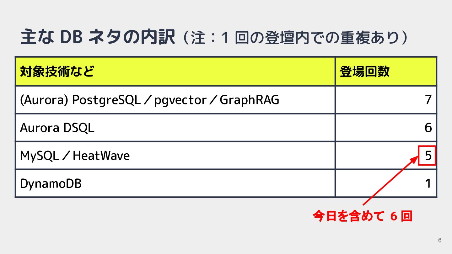 DSQL 6 MySQL/HeatWave 5 DynamoDB 1 6 今日を含めて 6 回