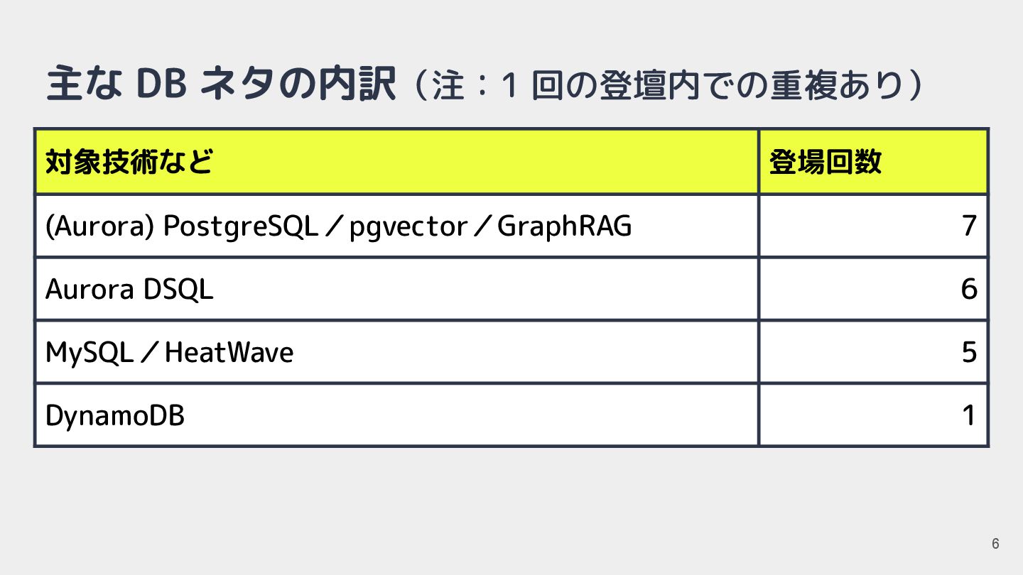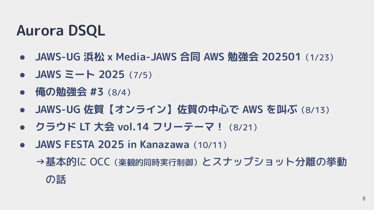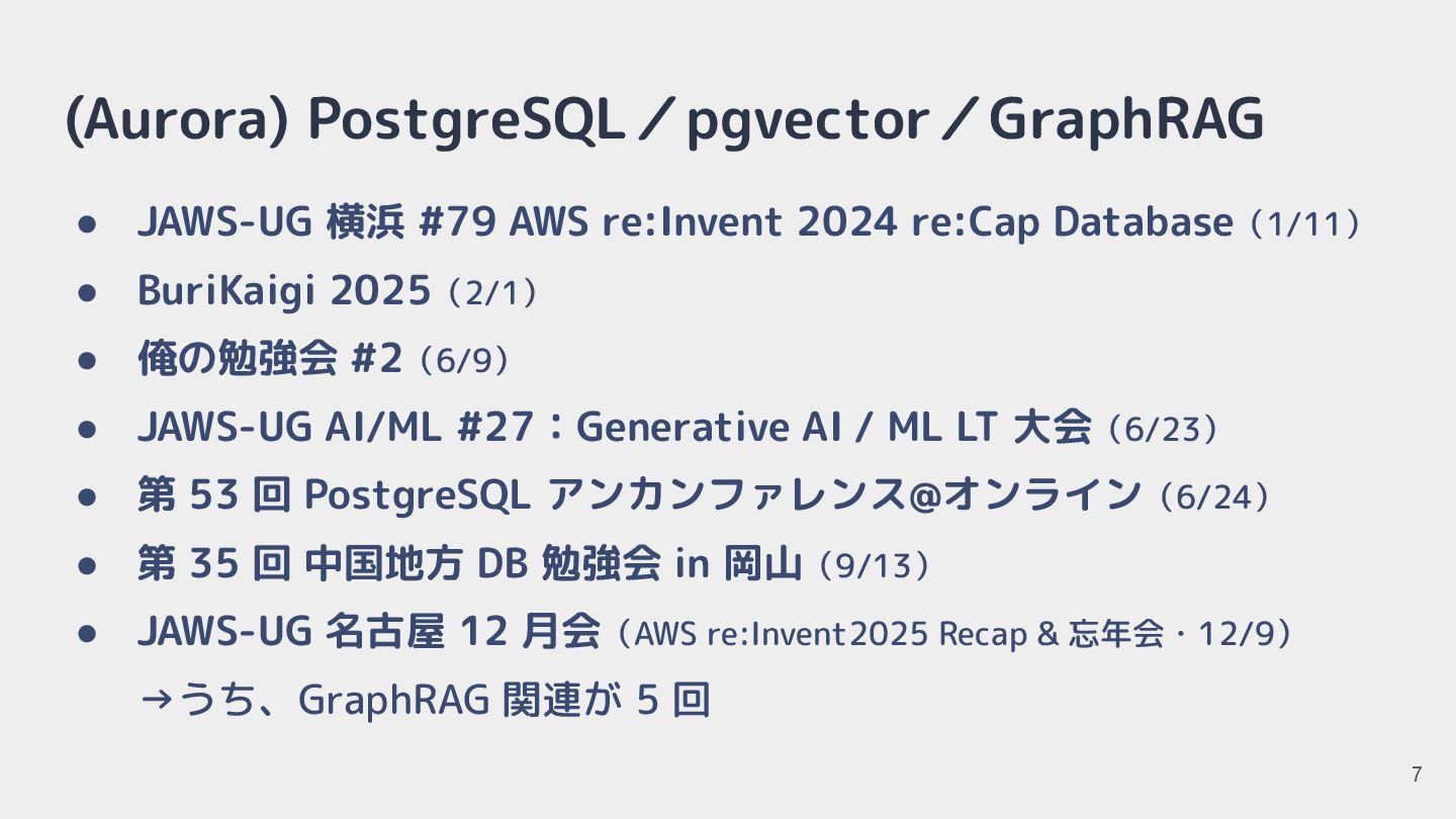 Database(1/11) • BuriKaigi 2025(2/1) • 俺の勉強会 #2(6/9) • JAWS-UG AI/ML #27:Generative AI / ML LT 大会(6/23) • 第 53 回 PostgreSQL アンカンファレンス@オンライン(6/24) • 第 35 回 中国地方 DB 勉強会 in 岡山(9/13) • JAWS-UG 名古屋 12 月会(AWS re:Invent2025 Recap & 忘年会・12/9) →うち、GraphRAG 関連が 5 回 7