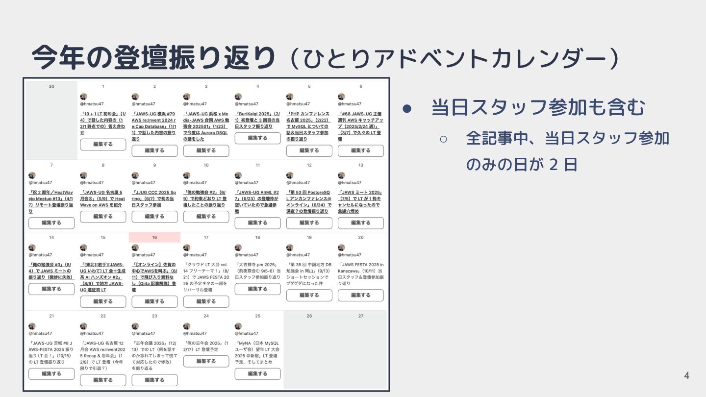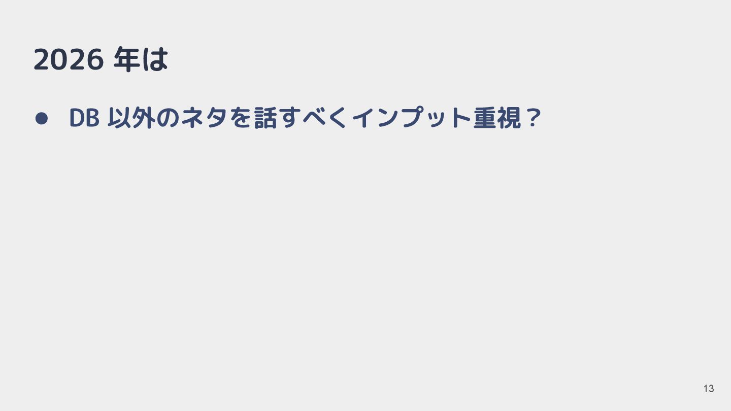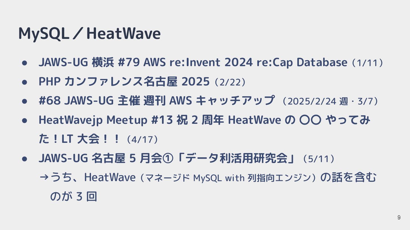 Database(1/11) • BuriKaigi 2025(2/1) • 俺の勉強会 #2(6/9) • JAWS-UG AI/ML #27:Generative AI / ML LT 大会(6/23) • 第 53 回 PostgreSQL アンカンファレンス@オンライン(6/24) • 第 35 回 中国地方 DB 勉強会 in 岡山(9/13) • JAWS-UG 名古屋 12 月会(AWS re:Invent2025 Recap & 忘年会・12/9) →うち、GraphRAG 関連が 5 回 7