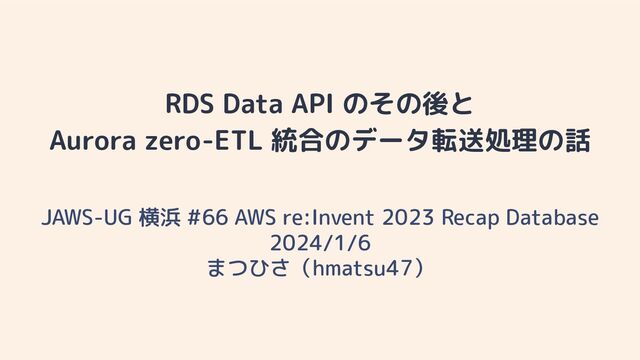 Data API に対応(2023/12/21 発表) ◦ https://aws.amazon.com/jp/about-aws/whats-new/2023/12/amazon-aurora-postgre sql-rds-data-api/ ◦ 同時にクエリエディタと Knowledge Base for Amazon Bedrock (ベクターストアとして)にも対応 ▪ https://dev.classmethod.jp/articles/aurora-serverless-v2-query-editor-connection/ ▪ https://qiita.com/hayao_k/items/45e59c1c2a183c27b20d 9