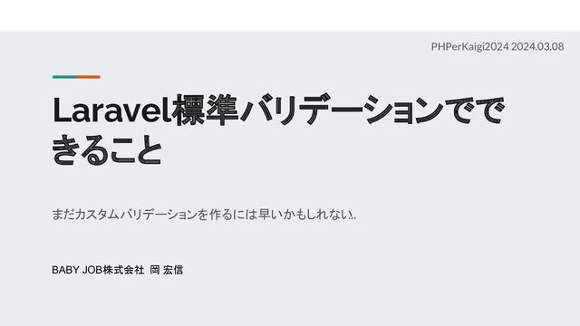 Laravel標準バリデーションでで きること まだカスタムバリデーションを作るには早いかもしれない ... BABY JOB株式会社 岡 宏信 PHPerKaigi2024 2024.03.08