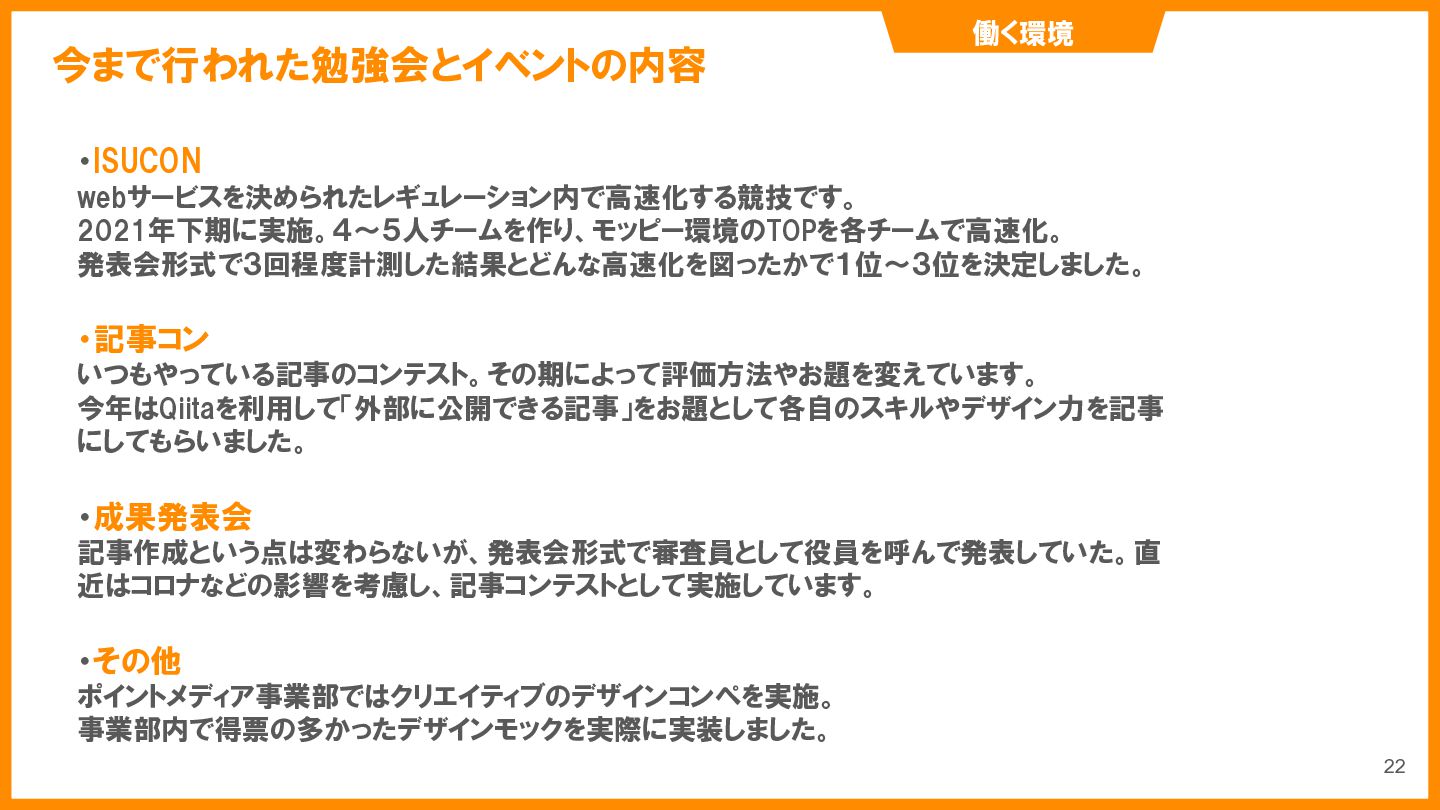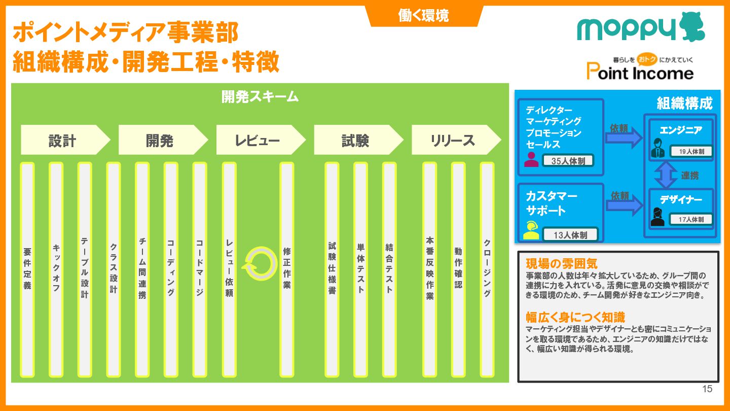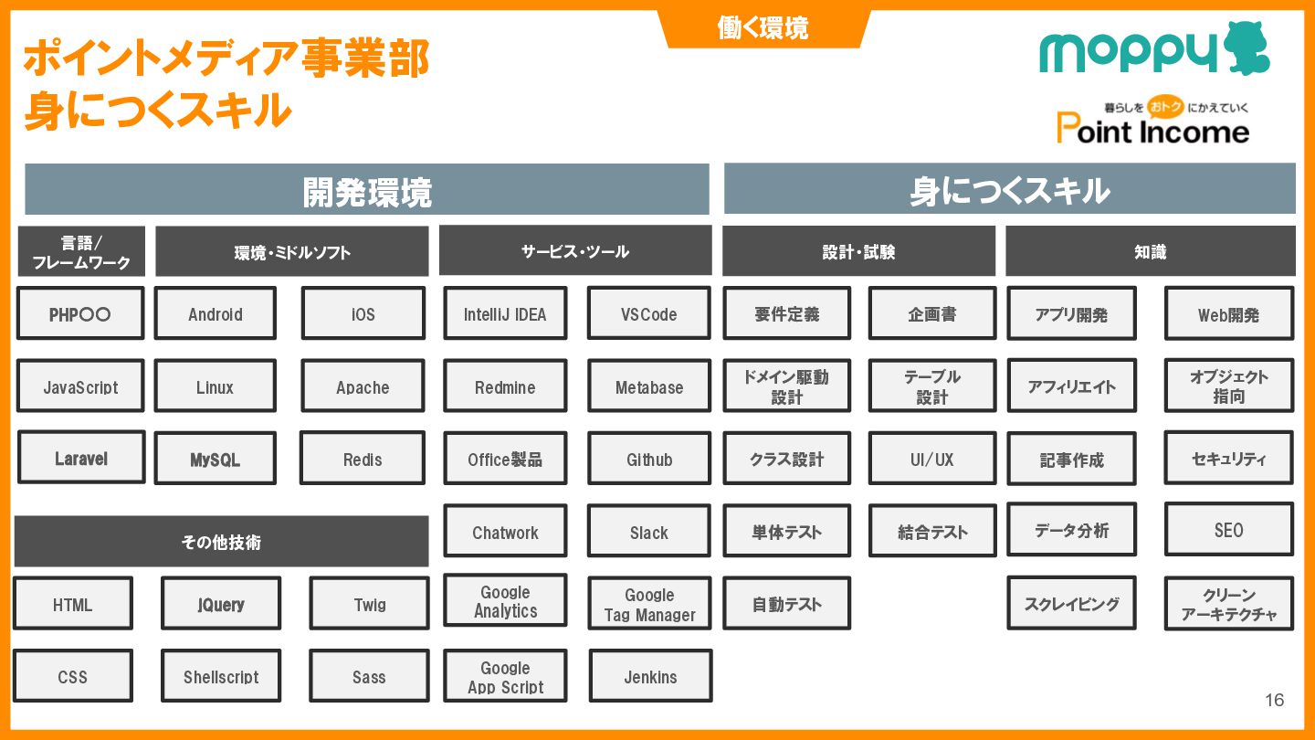 キ ッ ク オ フ ク ラ ス 設 計 テ ー ブ ル 設 計 チ ー ム 間 連 携 コ ー デ ィ ン グ レ ビ ュ ー 依 頼 修 正 作 業 試 験 仕 様 書 単 体 テ ス ト 結 合 テ ス ト コ ー ド マ ー ジ 本 番 反 映 作 業 動 作 確 認 ク ロ ー ジ ン グ 働く環境 組織構成 現場の雰囲気 事業部の人数は年々拡大しているため、グループ間の 連携に力を入れている。活発に意見の交換や相談がで きる環境のため、チーム開発が好きなエンジニア向き。 幅広く身につく知識 マーケティング担当やデザイナーとも密にコミュニケーショ ンを取る環境であるため、エンジニアの知識だけではな く、幅広い知識が得られる環境。 ディレクター マーケティング プロモーション セールス 35人体制 カスタマー サポート 13人体制 依頼 依頼 エンジニア デザイナー 19人体制 17人体制 連携 ポイントメディア事業部 組織構成・開発工程・特徴 15