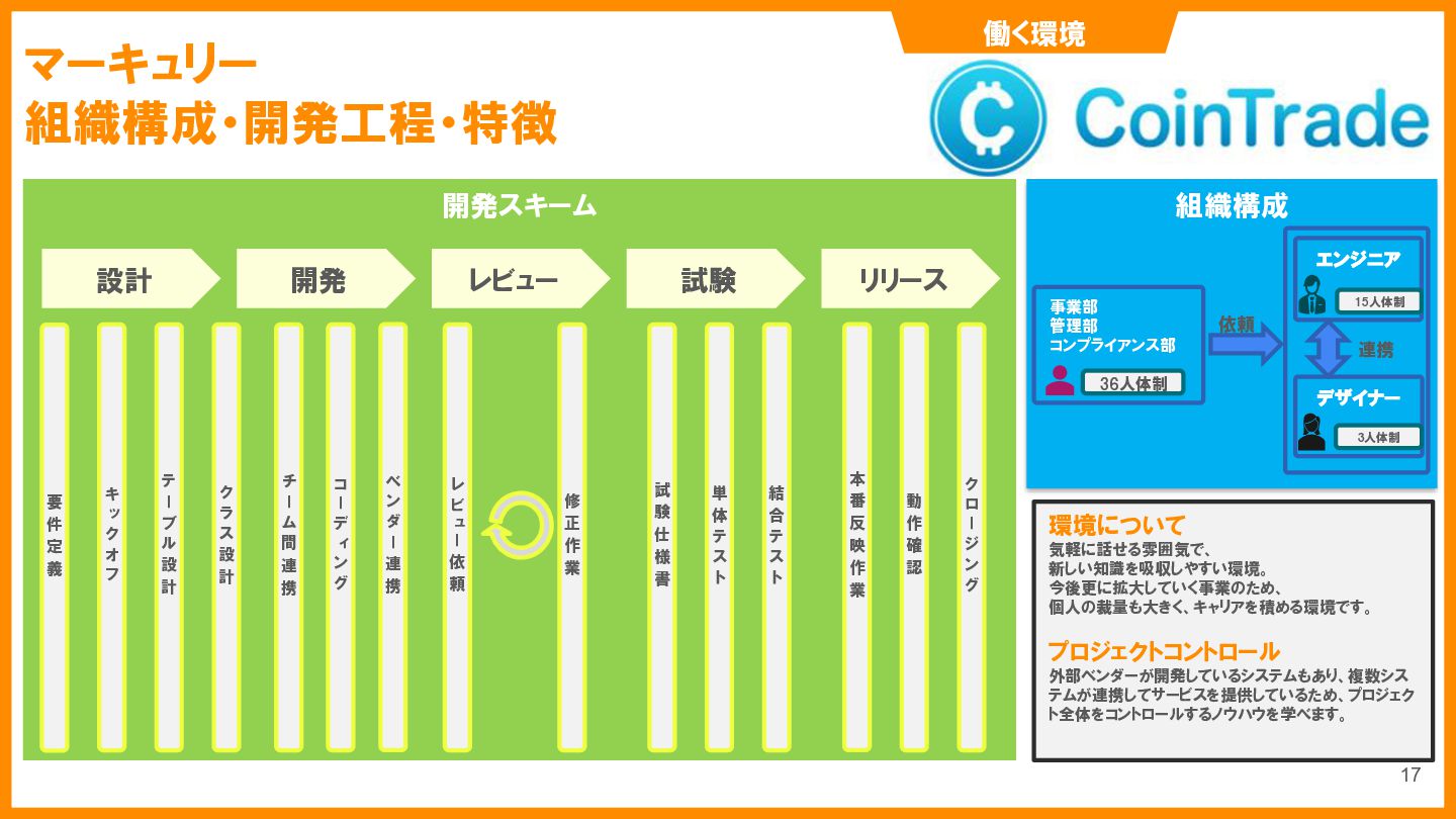 キ ッ ク オ フ ク ラ ス 設 計 テ ー ブ ル 設 計 チ ー ム 間 連 携 コ ー デ ィ ン グ レ ビ ュ ー 依 頼 修 正 作 業 試 験 仕 様 書 単 体 テ ス ト 結 合 テ ス ト 本 番 反 映 作 業 動 作 確 認 ク ロ ー ジ ン グ 組織構成 環境について 気軽に話せる雰囲気で、 新しい知識を吸収しやすい環境。 今後更に拡大していく事業のため、 個人の裁量も大きく、キャリアを積める環境です。 プロジェクトコントロール 外部ベンダーが開発しているシステムもあり、複数シス テムが連携してサービスを提供しているため、プロジェク ト全体をコントロールするノウハウを学べます。 事業部 管理部 コンプライアンス部 36人体制 依頼 エンジニア デザイナー 15人体制 3人体制 ベ ン ダ ー 連 携 連携 マーキュリー 組織構成・開発工程・特徴 働く環境 17