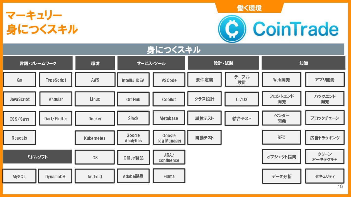 IntelliJ IDEA Metabase VSCode Slack Copilot Google Analytics React.js フロントエンド 開発 アプリ開発 ブロックチェーン Web開発 ベンダー 開発 バックエンド 開発 要件定義 クラス設計 テーブル 設計 結合テスト 知識 設計・試験 単体テスト UI/UX SEO Linux Docker Dart/Flutter 環境 ミドルソフト AWS DynamoDB iOS 広告トラッキング Google Tag Manager 自動テスト 身につくスキル Kubernetes Android Office製品 オブジェクト指向 クリーン アーキテクチャ データ分析 セキュリティ マーキュリー 身につくスキル 働く環境 Adobe製品 JIRA/ confluence Figma 18