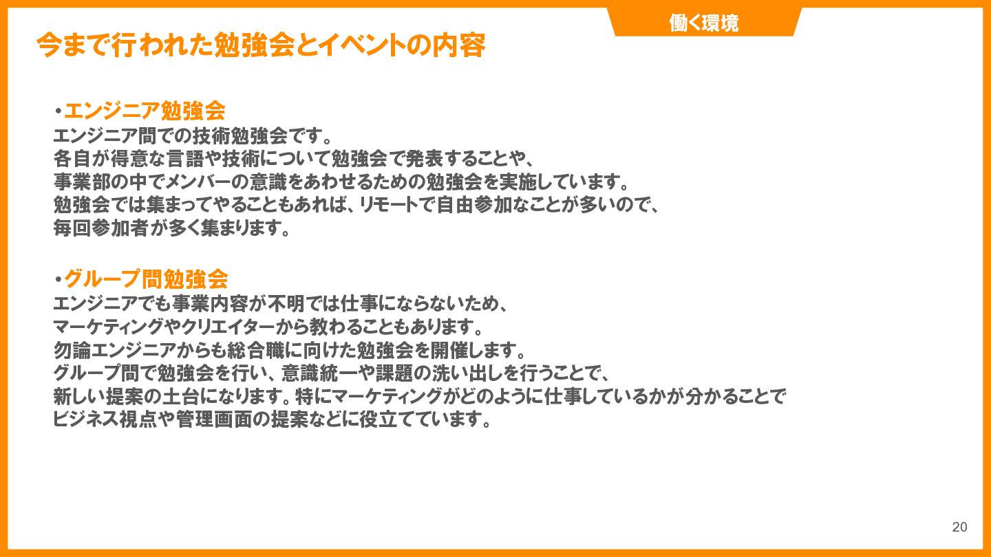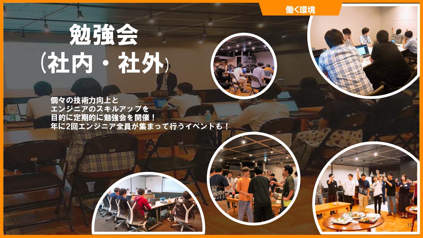 8. 働く環境 人で支え合う制度 メンター制度 勉強会 コミ活 メンターが業務面で しっかりサポート。 各個人の目標と一緒に並走します 社内では勉強会が定期的に開かれ ており、スキルアップの機会を提