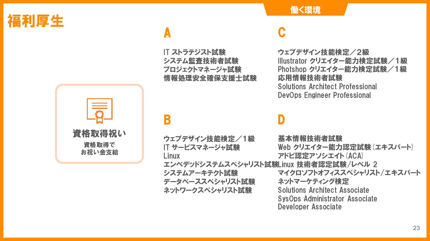 B ウェブデザイン技能検定/1級 IT サービスマネージャ試験 Linux エンベデッドシステムスペシャリスト試験 システムアーキテクト試験 データベーススペシャリスト試験 ネットワークスペシャリスト試験 C ウェブデザイン技能検定/2級 Illustrator クリエイター能力検定試験/1級 Photshop クリエイター能力検定試験/1級 応用情報技術者試験 Solutions Architect Professional DevOps Engineer Professional D 基本情報技術者試験 Web クリエイター能力認定試験(エキスパート) アドビ認定アソシエイト(ACA) Linux 技術者認定試験/レベル 2 マイクロソフトオフィススペシャリスト/エキスパート ネットマーケティング検定 Solutions Architect Associate SysOps Administrator Associate Developer Associate 働く環境 23