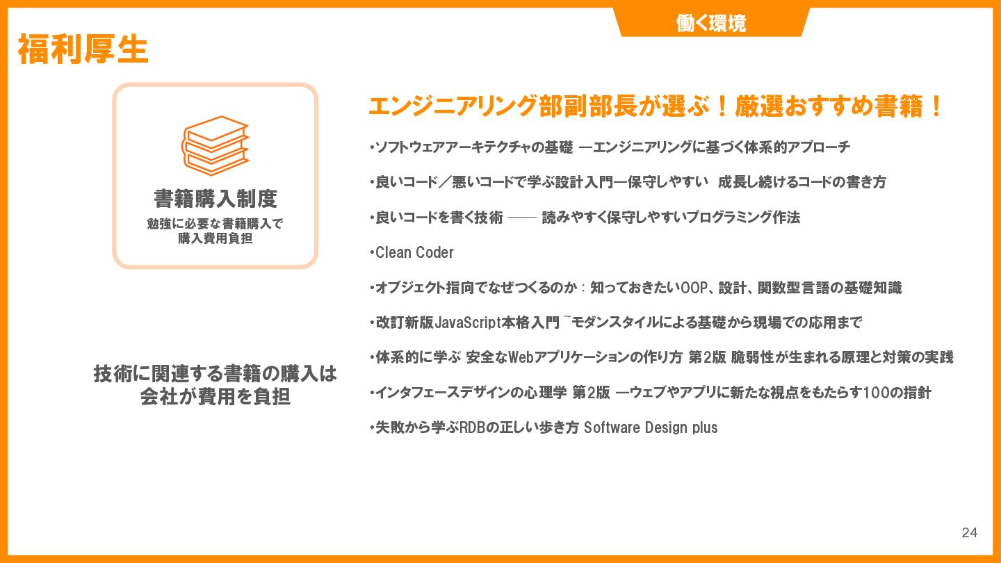 ── 読みやすく保守しやすいプログラミング作法 ・Clean Coder ・オブジェクト指向でなぜつくるのか : 知っておきたいOOP、設計、関数型言語の基礎知識 ・改訂新版JavaScript本格入門 ~モダンスタイルによる基礎から現場での応用まで ・体系的に学ぶ 安全なWebアプリケーションの作り方 第2版 脆弱性が生まれる原理と対策の実践 ・インタフェースデザインの心理学 第2版 ―ウェブやアプリに新たな視点をもたらす100の指針 ・失敗から学ぶRDBの正しい歩き方 Software Design plus 技術に関連する書籍の購入は 会社が費用を負担 働く環境 24