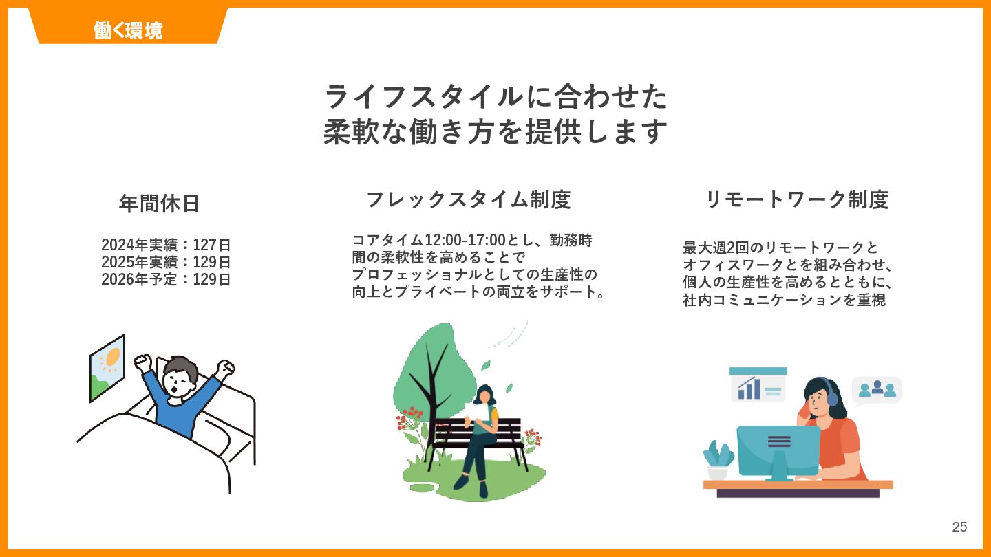 10. 働く環境 休暇 パパママ支援 慶弔休暇 慶弔・公事の休暇 有給休暇 全休or半休取得可 リフレッシュ休暇 勤続3年で5日間付与 長期休暇